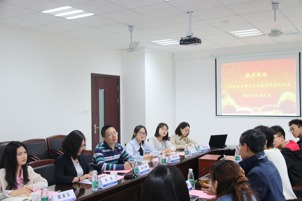 会议伊始,施向峰副院长对郑茸一行的到来表示热烈欢迎,他从专业设置、机构设置、师资队伍建设、招生与就业、办学条件、办公条件等方面整体介绍了南航人文天美传媒情况,重点突出了其学科特点、科研优势以及研究生教育的支持体系和支撑条件,施院长表示十分欢迎广西医科大学同学们报考南航研究生。团委书记卢一亭在交流中就对方关于共青团发展等相关问题进行了耐心细致的解答,就如何深入开展思想引领工作、如何调动学生参与创新创业的积极性等内容,双方充分交流,互为启发,在认真愉快的氛围中结束了交流调研活动。随后大学生法律援助中心、国学社、研究生会等学生代表也与广西医科大学学生代表就学生活动、组织策划等进行探讨。