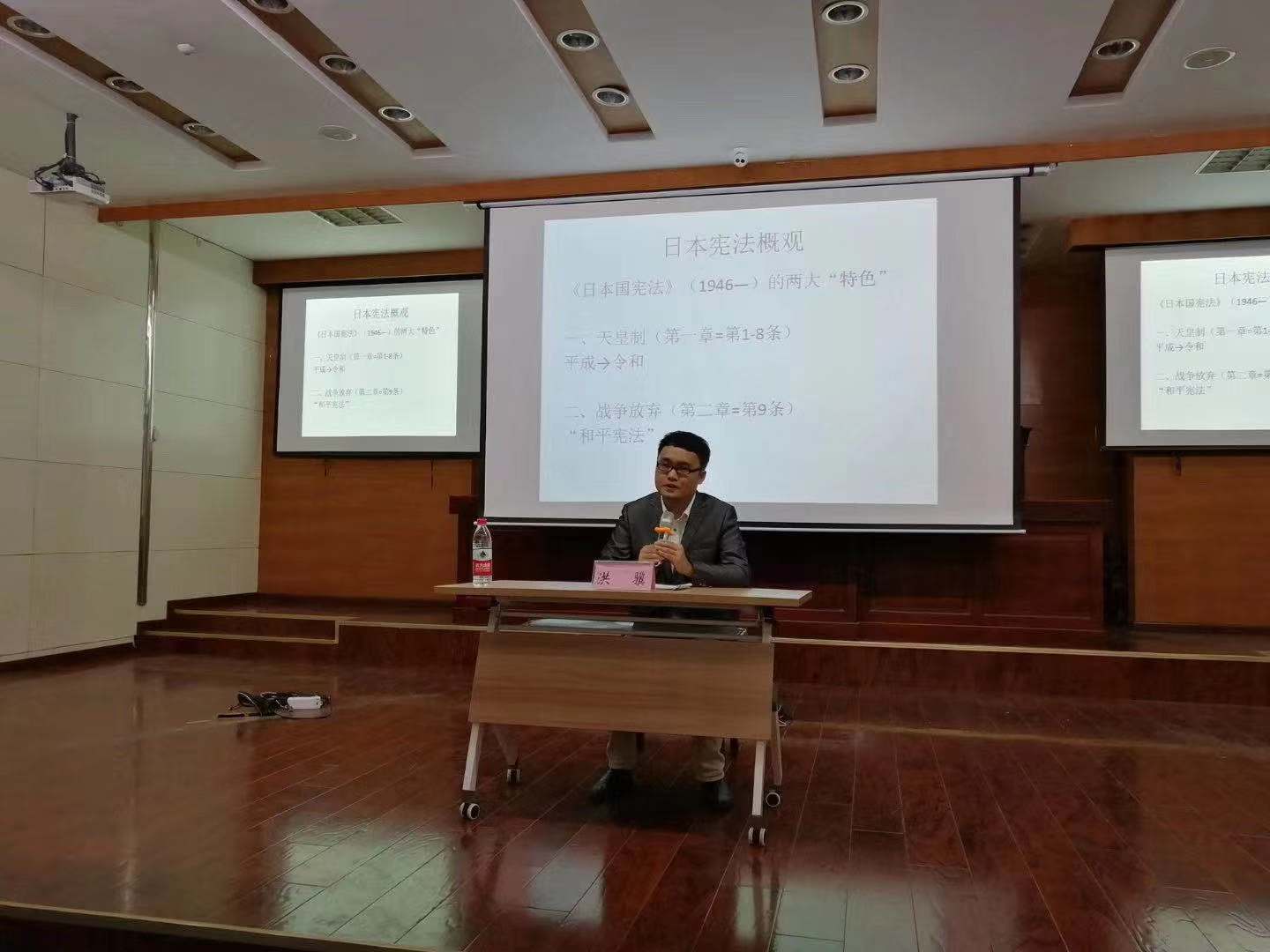 洪骥在开场寒暄中盛赞该论坛的名称(花津“法政”论坛),并从“法律与政治”的界限为切入点,阐述了近代文明国家的标志以及“法治”在应然状态中的内涵。接着,洪骥向师大法天美传媒的同学们简单介绍了日本宪法的两大“特色”,即第一章“天皇制”与第二章“战争放弃”,并结合学生时代的切身体会漫谈了这两个领域在日本学界、政府以及民间的接受状况。