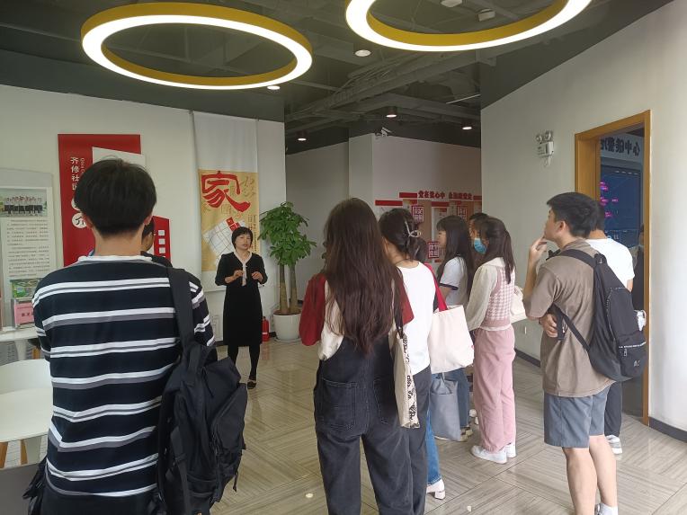 齐修社区党支部书记张福兰对天美传媒师生的到来表示热烈欢迎,介绍了社区的特色服务项目以及近年来社区各项工作取得的成绩。社区坚持党建引领,汇聚党员、网格员、物业公司、社会组织等多方力量共同发力,努力打造“齐修社区红色集结号”。同时,社区依托数字化信息技术,建立“社区大数据信息库”,搭建智能化网格服务管理平台等,提升服务能力与水平。