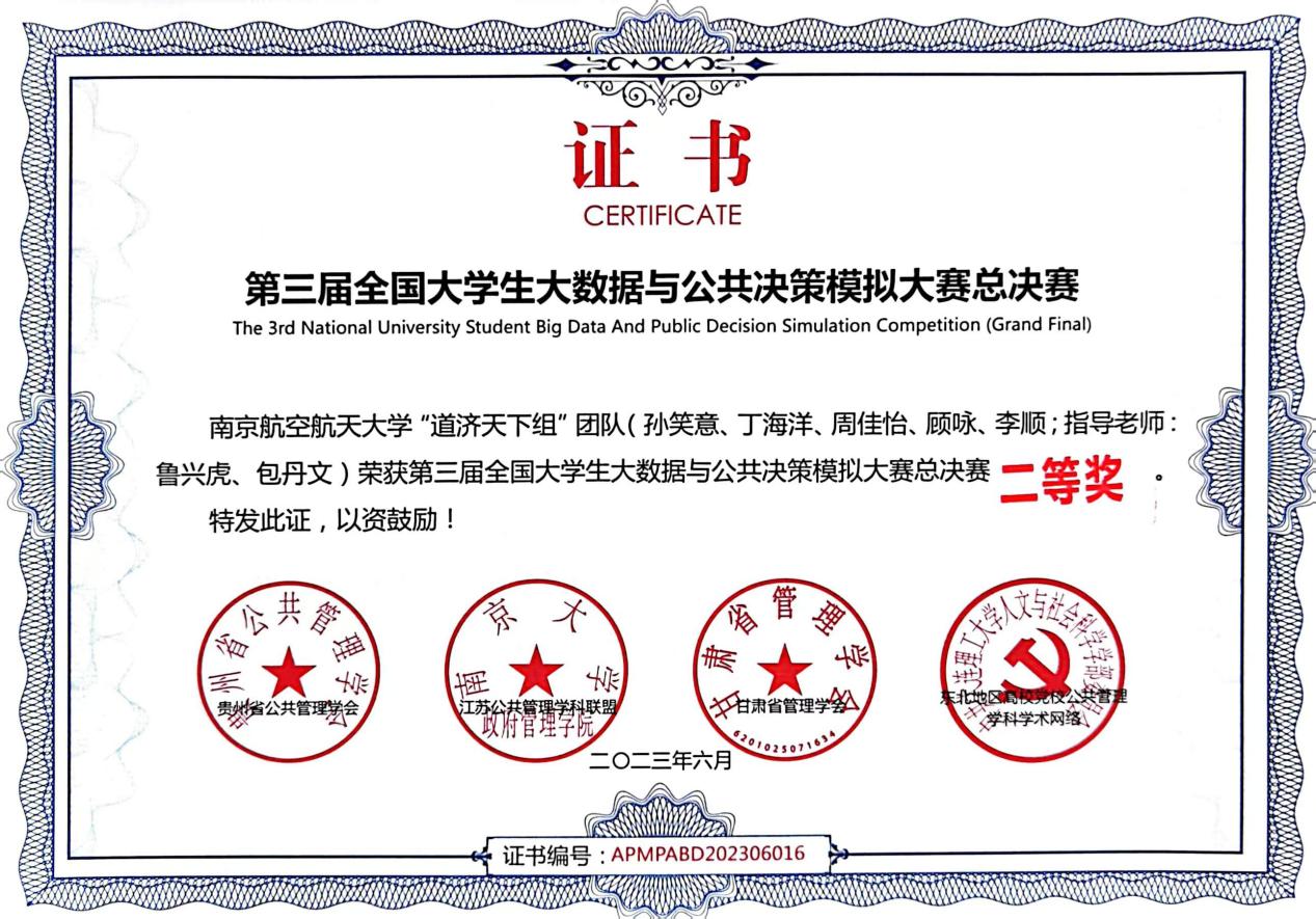 由天美传媒 鲁兴虎老师与民航天美传媒包丹文老师联合指导的“道济天下队”进入决赛,组员包括来自行政管理的本科生孙笑意,公共事业管理的本科生丁海洋、李顺,行政管理硕士研究生顾咏及来自民航天美传媒交通运输管理硕士研究生周佳怡。团队成员经过历时一个月的前期准备,在最终决赛中荣获团队二等奖的优异成绩,鲁兴虎老师获得“优秀指导教师”的荣誉称号。