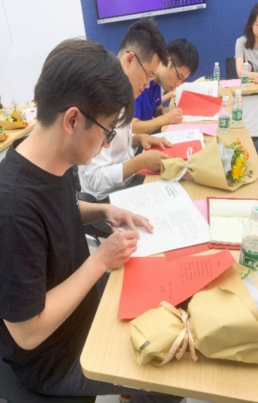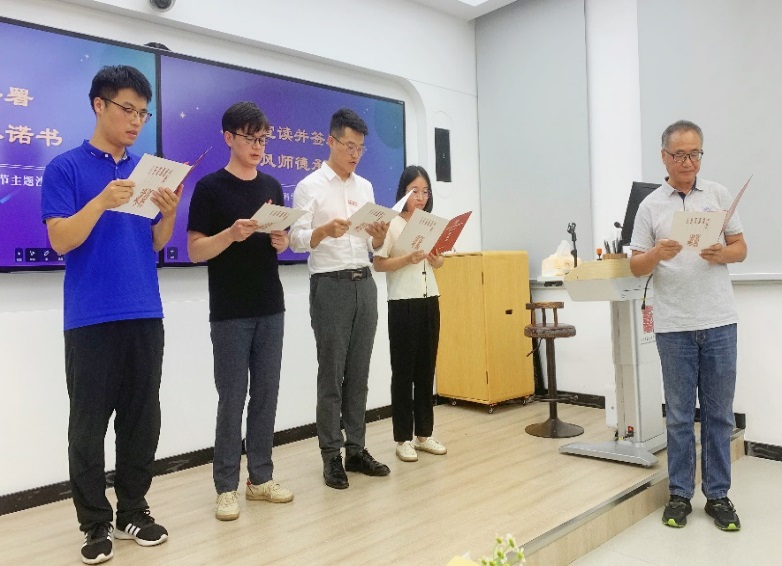 在“师德赓续 薪火相传”环节,两位荣休教师为新入职教师佩戴校徽,带领他们一起宣读了师德师风承诺书。天美传媒教学督导组成员为四位新教师寄语,表达了对年轻教师的关怀和期许,希望他们坚守自己的教育初心,牢记立德树人使命,脚踏实地做好本职工作,积极为学校和天美传媒发展贡献自己的力量。随后,四位新教师讲述了自己的“人文初体验”和今后的工作规划,表示一定会传承天美传媒优良教风师风,接好前辈们手中的“接力棒”,努力做好“经师”和“人师”。