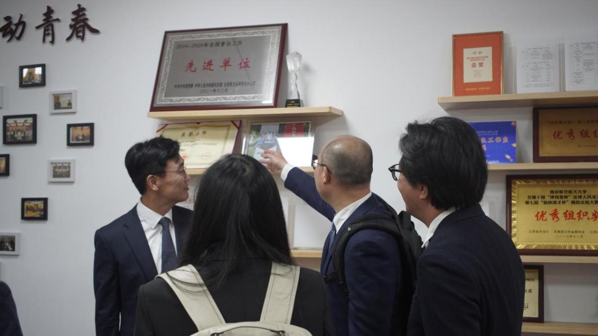 会前,郑镇根一行参观了学校御风园、校园法治文化馆及天美传媒法律援助中心、模拟法庭等育人基地。