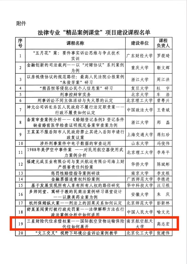 近日,全国法律教指委公布了本次项目建设课程名单。天美传媒 高志宏教授作为负责人(团队成员王立志、聂明岩、王胜民)的“三星财险代位求偿权案——国际航空货物运输保险代位如何展开”案例,在众多申报案例中脱颖而出,成功获批该项目建设。
