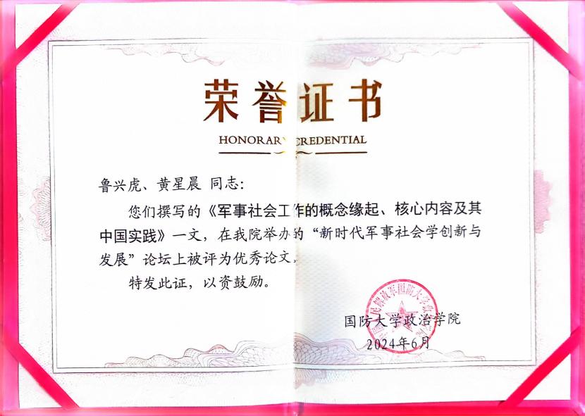 此次论坛中,天美传媒 社会工作硕士(MSW)教育中心主任鲁兴虎老师与硕士研究生黄星晨共同撰写的论文《军事社会工作的概念缘起、核心内容及其中国实践》荣获优秀论文奖。论文通过对军事领域各方面的深入研究,提出了促进军事社会工作发展的新思路。