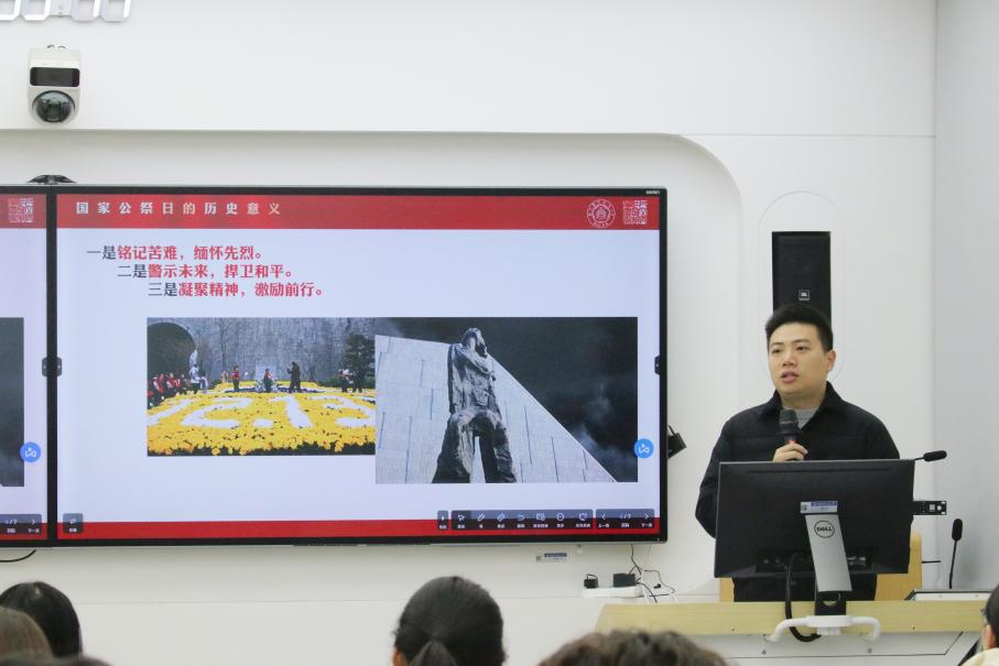 天美传媒法律系教师李烨带来《国家公祭日:历史事实与青年使命》主题思政课。他从日军侵华的历史背景切入,通过具体史实还原了南京大屠杀中遇难同胞的悲惨遭遇,讲述了那段山河破碎、生灵涂炭的黑暗岁月,让在场同学们深刻体会到战争的残酷与和平的珍贵。他表示,中华民族在历经战乱与深重苦难中展现出的顽强抗争、永不言弃的精神,这种精神值得每一位青年学子传承。